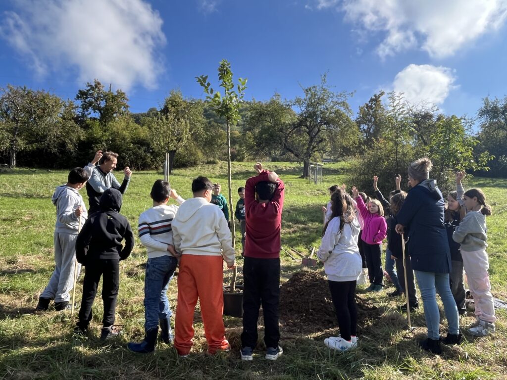Unsere Klasse 4b hat am 02.Oktober einen Ausflug auf unsere Streuobstwiese auf der Achalm gemacht. Wir sind zu Fuß gelaufen und sind dabei auch viele Treppen gestiegen. Herr Hermann hat auf der Streuobstwiese schon auf uns gewartet. Wir wurden in 4 Gruppen eingeteilt und haben an unterschiedlichen Stationen gearbeitet. An einer Station haben wir geholfen die alten Äste der anderen Bäume zu zerschneiden und zu zerkleinern. An der zweiten Station haben wir ein Naturbild gelegt. An der dritten Station haben wir Äpfel eingesammelt, geschält und geschnitten. An der letzten Station haben wir ein großes Loch für unseren Apfelbaum gegraben. Gemeinsam haben wir dann unseren Baum eingepflanzt. Zum Schluss haben wir unserer Florina, das ist die Apfelsorte, ein Geburtstagslied gesungen. Am Nachmittag haben wir in der Schule noch unsere geschälten und geschnittenen Äpfel verarbeitet und Apfelpfannkuchen gemacht, die uns sehr geschmeckt haben!